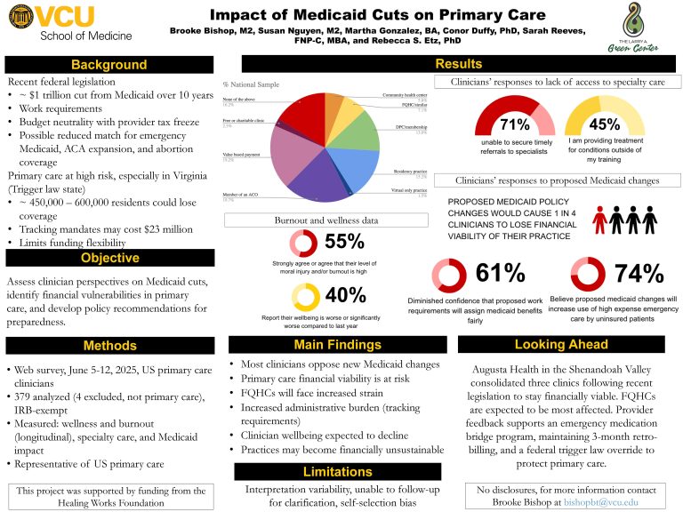 Impacts of Medicaid Cuts on Primary Care – Lead Author: Brooke Bishop, MS2, Additional Authors: Dr. Rebecca S. Etz, Sarah Reves (NP), Martha Gonzalez, Connor Duffy, & Susan Nguyen (MS2) – Virginia Commonwealth University School of Medicine (Type of Project: Poster on Completed Scholarly Activity)