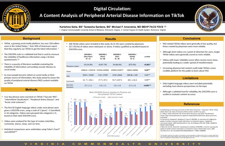 Digital Circulation: A Content Analysis of Peripheral Arterial Disease Information on TikTok – Lead Author: Karishma Setia, MS4, Additional Authors: Taneesha Sardana BS & Michael F. Amendola MD MEHP FSVS FACS – Virginia Commonwealth University School of Medicine (Type of Project: Poster on Completed Scholarly Activity)