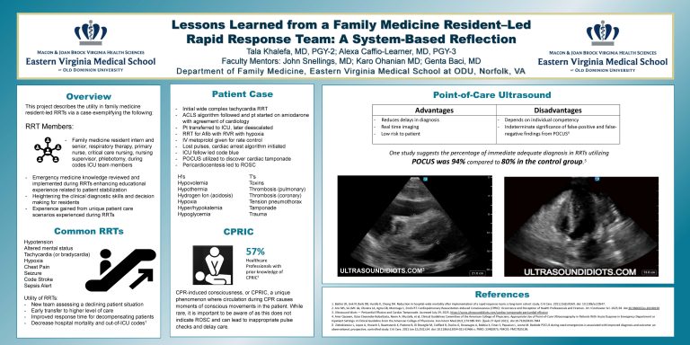 Lessons Learned from a Family Medicine Resident–Led Rapid Response Team: A System-Based Reflection – Lead Author: Tala Khalefa, MD, PGY-2, Additional Author: Alexa Caffio-Learner, MD, PGY-3 – Macon & Joan Brock Virginia Health Sciences Eastern Virginia Medical School at Old Dominion University (Type of Project: Poster on Completed Scholarly Activity)