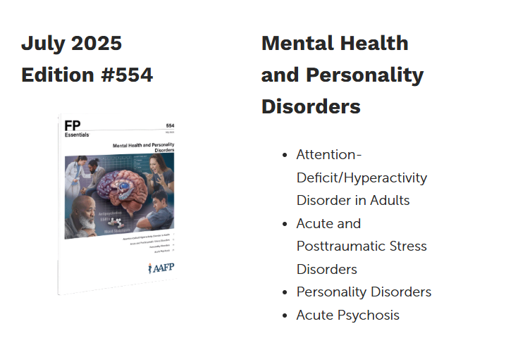 Topics include Attention Deficit/Hyperactivity Disorder in Adults; Acute and Posttraumatic Stress Disorders; Personality Disorders; Acute Psychosis
